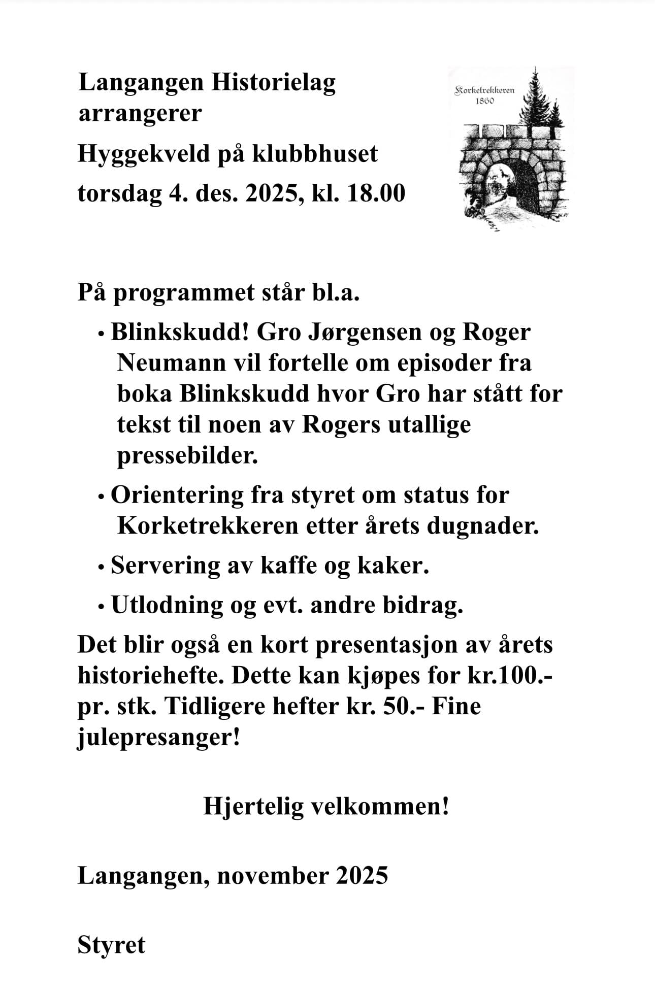 Program hyggekveld på klubbhuset torsdag 04.12.25 kl.18.00